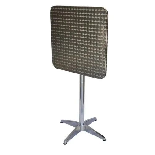 Versatile folding table that can be assembled at either dining or bar height. Includes base and stainless steel table top in 2 sizes.