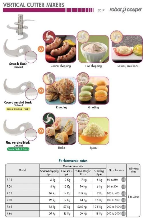 With its bowl-base twin-blade assembly – a Robot-Coupe innovation – it is the ideal assistant in your kitchen. All preparations can be made by simply pressing a button: emulsions and sauces; mince meat and fish; chop onions, herbs and spices; grind nuts, chocolate or praline; knead dough.